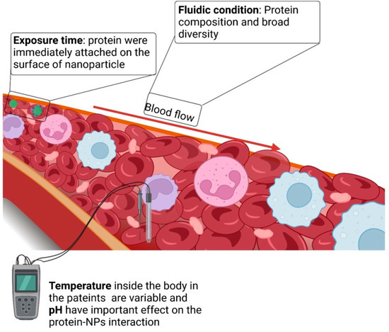 Blood flow is another important physical element that must be considered. Blood moves at a constant rate, ranging from 0.085 cm.s−1 in capillaries to 10 cm.s−1 in arteries, and a maximum of 60 cm.s−1 inside the aorta. Protein binding generally strengthens with increasing blood flow. However, the exact underlying cause is unknown, and it is speculated that the enhanced protein–blood interactions result from increased interactions between biological molecules and the nanostructures. Additionally, rapid flow rates induce shear stress on the outer layer of nanostructures, preventing the easy deposition of proteins and making it easier for them to connect with others that possess stronger affinity. For example, this might lead to the enrichment of proteins on the nanoparticles, such as plasminogen and other proteins. Similarly, blood flow could alter the conformational shape of unbound proteins, such as plasminogen or the von Willebrand factor (a protein that alleviates the dormant factor VIII blood-clotting protein).