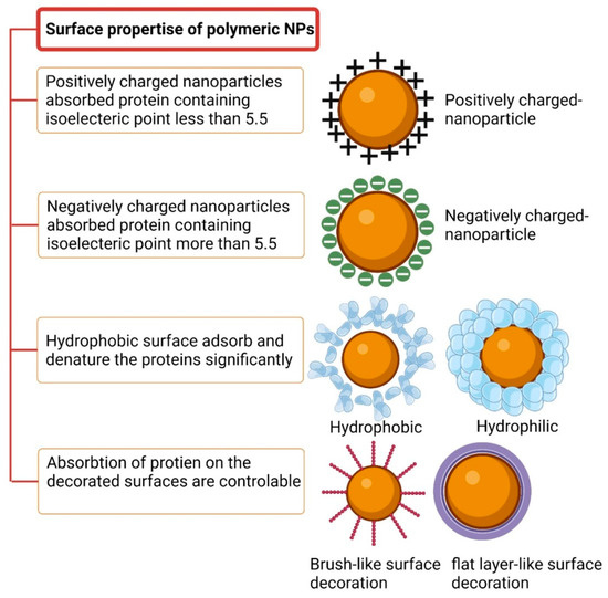Walkey and Chan reviewed a group of plasma proteins called adsorbomes that are commonly found in the protein coronas of nanomaterials [87]. This list is expected to grow in the future with increasing research on the topic. Based on nearly 20 years of research, a “normal” plasma protein corona consists of approximately 2–6 proteins that are bound abundantly, along with numerous additional proteins that are bound with lower abundances. Most nanomaterials are connected to only a small fraction of plasma adsorbomes, and only a small fraction of the adsorbomes is related to abundant nanomaterials. The “Vroman effect” defines the competition of proteins on the confined surface of nanoparticles, taking into account the effects of the incubation period, protein concentration, and protein-to-nanoparticle surface adsorption affinity [88]. Figure 7 illustrates the effects of surface properties on the protein corona. Another crucial factor related to the associated proteins is the positive or negative charge, which is typically analyzed in terms of zeta potential. Protein adsorption is enhanced when nanoparticles are efficiently charged (either more positively or more negatively). The isoelectric point (IEP) corresponds to the pH value at which a particle has no charge. Positively charged nanoparticles strongly bind to biomolecules with IEP values lower than 5.5, such as BSA, whereas nanoparticles with negative surface charge tend to bind to proteins with IEP values higher than 5.5, such as IgG [89]. Serum protein adsorption changes as the surface charge density of PNPs increases. Gessner et al. observed this effect using negatively charged PNPs [90]. Additionally, Bradley et al. discovered C1q binding to anionic liposomes and observed plasma protein adsorption on cationic lipid-based vesicles. These phenomena may occur due to electrostatic interactions between positively charged serum biomolecules and lipids. The adsorbed proteins can potentially be denatured by the surface charge [91].