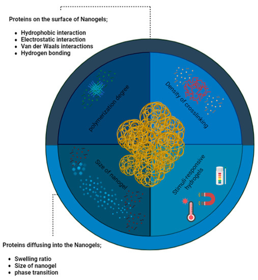 Proteins, which consist of twenty distinct amino acids, encompass a diverse array of properties, ranging from polar and non-polar to hydrophobic and hydrophilic. The primary, secondary, tertiary, and quaternary structures of proteins are constructed through covalent and non-covalent bonding, including electrostatic attraction, hydrogen bonding, and hydrophobic interactions, ultimately resulting in the formation of intricate 2D and 3D protein structures. As chemically active macromolecules, proteins engage in various types of interactions to initiate or catalyze biological processes. When presented with a substrate, proteins readily bind, and likewise, when encountering bare PNPs and nanogels, they readily adhere to their surfaces, employing different bonding techniques for this purpose [27].