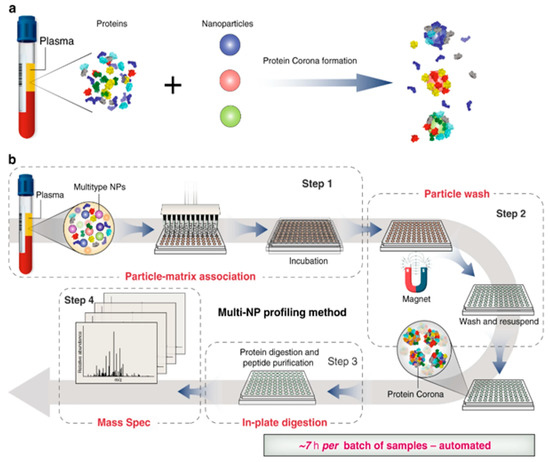 - Blume, J.E.; Manning, W.C.; Troiano, G.; Hornburg, D.; Figa, M.; Hesterberg, L.; Platt, T.L.; Zhao, X.; Cuaresma, R.A.; Everley, P.A.; et al. Rapid, deep and precise profiling of the plasma proteome with multi-nanoparticle protein corona. Nat. Commun. 2020, 11, 3662. [Google Scholar] [CrossRef]