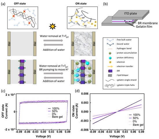 To fabricate the BR-incorporated device, we deposited a BR membrane on an ITO plate with a gelatin film, which was then sandwiched with another ITO plate with a gelatin film, as illustrated in Figure 1b. The gelatin film on each of the ITO plates had a thickness of 152 μm, and the dried gelatin film after the water loss had a thickness of about 100 μm. The protruding ITO plates on both sides were clamped with alligator clips for subsequent electrical measurements. Due to possible preferential orientation during deposition, the gelatin surfaces on the deposition side and the counter side may experience different environments. More information can be found in the next subsection.