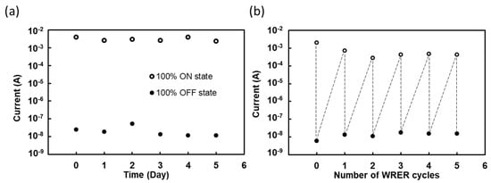 This type of memory also demands repeatable switching between the ON and OFF states, and it often relies on voltage or current for the reprogrammability [,]. To assess the stability and reprogrammability of the BR-incorporated gelatin device, we conducted tests for retention time and WRER (write–read–erase–reread) cycles, as depicted in Figure 2a and Figure 2b, respectively. Figure 2a demonstrates that at 0.09 V, the increased current of the 100% BR-incorporated gelatin device can be maintained in the ON state for up to 5 days. Furthermore, Figure 2b reveals that the device is capable of enduring five WRER cycles, signifying its potential application in non-volatile memories.