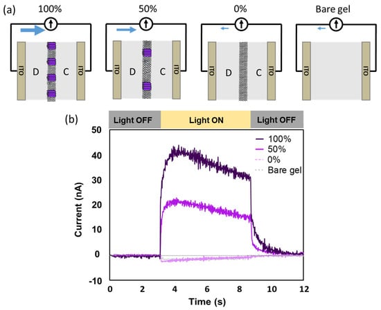 Conversely, in the bare gelatin device and the 0% BR device, small negative currents were observed. The negative currents are likely attributed to the delocalization of electrons of the ITO plates, which is induced by the ultraviolet band in the light []. Since the system was illuminated from the deposited side, the ITO at the deposited side had a higher likelihood of electron delocalization and pressure compared to the ITO plate at the counter side. As a result, electron movement occurred from the deposited side electrode to the counter side electrode in the external circuit, which is equivalent to a current from the counter side electrode to the deposited side electrode in the external circuit.