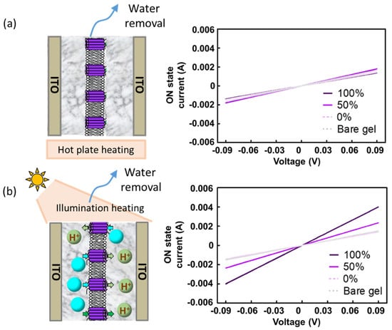 (a) Illustration and voltage sweep results of the gelatin device in the ON state using hotplate heating at 60 °C for 1 h as the writing process. (b) Illustration and voltage sweep results of the gelatin device in the ON state using illumination as the writing process.
