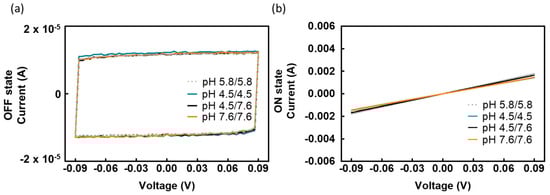 Voltage sweeps demonstrating (a) similar capacitor behaviors of gelatin films at various pH values in the OFF state, and (b) comparable resistor behaviors of gelatin films at various pH values in the ON state.