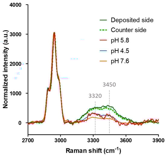 To investigate whether the presence of BR proton pumping activity could enhance the bound water content in the ON state gelatin devices, the Raman spectra of gelatin devices at pH = 4.5, 5.8, and 7.6 without BR membranes were compared with that with BR membranes. The peaks observed at 3320 cm−1 and 3450 cm−1 correspond to the OH stretching vibrations of tightly bound water [,,], which can be utilized to quantify the amount of bound water. The peaks in the range of 2800–3000 cm−1 originate from the CH stretching of gelatin. To ensure comparability, all spectra were scaled to achieve the same intensity of the CH stretching, thereby allowing for the normalization of bound water OH-stretching intensities by the gelatin content.