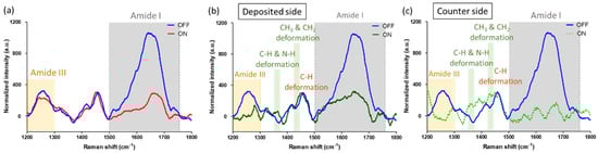 Figure 7a depicts the Raman spectra of a representative gelatin device without BR membranes. Comparing the ON state with the OFF state, lower intensities at 1530–1650 cm−1 and 1268 cm−1 suggest a loss of the triple-helix structure [,]. Figure 7b,c present the Raman spectra of the gelatin films at the deposited and counter sides of a 100% BR ratio memory device. In both cases, the spectra in the ON state exhibit significantly reduced intensities at 1530–1650 cm−1 and 1268 cm−1 compared to the OFF state spectra, indicating the loss of secondary structure. Notably, the decreases in the Raman intensities in the ON state BR-incorporated devices are more pronounced than those in the ON state gelatin device with no BR membranes, suggesting a more complete loss of secondary structure in the presence of BR membranes. Furthermore, an increase in intensity within the 1350–1460 cm−1 range, corresponding to CH, CH2, and CH3 vibrations, was observed in the ON state BR-incorporated gelatin device compared to the OFF state, implying greater flexibility in the gelatin polypeptide backbones. This increased flexibility supports the notion of more extensive unwinding of the gelatin polypeptides in the ON state BR-incorporated devices.