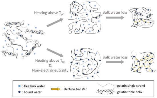 Finding suitable materials to bridge electronic devices and biological systems is a crucial challenge in various biomedical applications [,,,]. Electronic devices rely on electron conduction, while biological systems operate in an aqueous environment that traditionally hinders efficient long-distance electron transfer. In our previous work, we demonstrated that gelatin hydrogels can function as an electron-conductive resistor by removing unbound free water while retaining bound water []. The formation of a protein-bound water network can facilitate long-distance electron transfer in gelatin films.