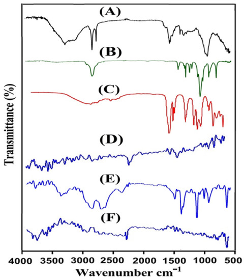 FTIR spectra of (A) XG, (B) PF-127, (C) Aa, (D) the unloaded XG/PF-127 hydrogel, (E) ATMH, and (F) the loaded XG/PF-127 hydrogel.
