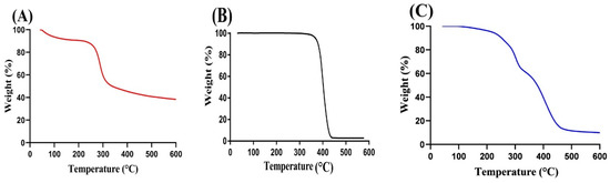 TGA of (A) XG, (B) PF-127, and (C) XG/PF-127 hydrogel.