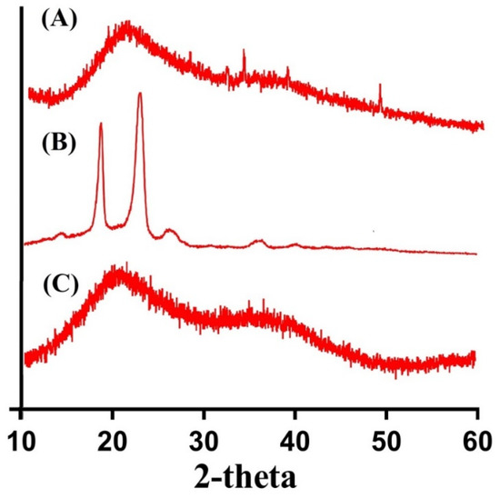 XRD of (A) XG, (B) PF-127, and (C) XG/PF-127 hydrogel.