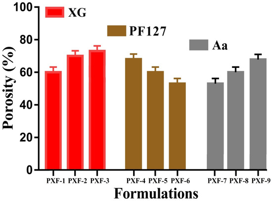 Effect of XG, PF-127, and Aa on porosity of XG/PF-127 hydrogel.