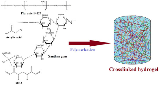 In the current study, the authors report ATMH-loaded polymeric hydrogels of xanthan gum and pluronic F-127 fabricated by the free radical polymerization technique. The combination of natural polymer xanthan gum and synthetic polymer pluronic F-127 with synthetic monomer acrylic acid increased the pH sensitivity of the fabricated hydrogels. The mechanical strength and stability of the developed hydrogels were increased due to the intermixing of natural and synthetic contents, which not only enhanced the swelling and loading of drugs, but also sustained the release of ATMH for an extended period of time (96 h). Characterization techniques such as FTIR, TGA, DSC, XRD, and SEM were performed for the formulated hydrogels. Similarly, a set of studies including sol–gel analysis, porosity, swelling, drug loading and release, along with kinetics modeling have been performed for the fabricated networks of hydrogel. Gelation mechanism of prepared hydrogels is shown below in Scheme 1.