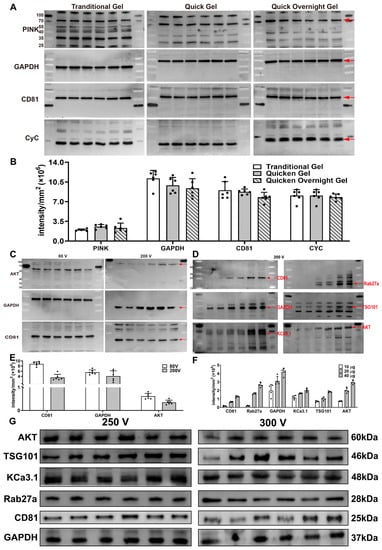 For proteins with a sufficiently high abundance, the appropriate extension of the electrotransfer time cannot have a significant effect on the signal intensity. As shown in Figure 2C,D, there was no significant statistical difference in the signal intensity of GAPDH at 15 min, 25 min, and 35 min. However, the signal intensity increased with the extension of electrotransfer time for PINK (70 kDa). In contrast, the signal intensity of CyC (15 kDa) decreased with the extension of the electrotransfer time. When the electrotransfer time was extended to 35 min, the protein marker of CyC could not be visualized (Figure 2C). These results show that proteins with low abundance have relatively suitable electrotransfer times. We extensively tested proteins with 15–130 kDa. Based on our experimental experience, we recommend the setting of the following parameters: 10–25 kDa, 25 V, 15 min; 25–55 kDa, 25 V, 20 min; 55–70 kDa, 25 V, 25 min; and 70–130 kDa, 25 V, 30–35 min.