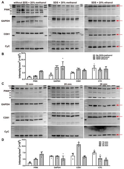 We replaced the methanol with ethanol in the semi-dry electrotransfer buffer (Tris 36.9 mM, glycine 39.1 mM, SDS 1.3 mM, and 20% ethanol). This upgraded formula decreased methanol vapor. Among the tested proteins, the signal-to-noise ratios of GAPDH, CD81, and CyC were not statistically different between the two groups. However, the signal-to-noise ratio of PINK was the strongest in the ethanol group (Figure 2A,B). In addition, we also tested the effect of SDS on electrotransfer efficiency. Our results imply that the addition of SDS enhanced the signal intensities of GAPDH and CD81 (Figure 2A,B).