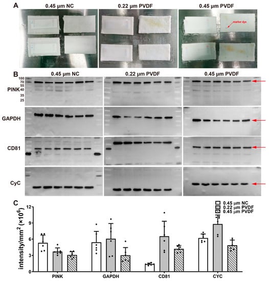 We conducted a comparative study on a 0.22 μm PVDF membrane, 0.45 μm PVDF membrane, and 0.45 μm NC membrane. Our results show that the 0.45 μm PVDF could not effectively intercept protein marker dye (Figure 3A), and small-molecular-weight proteins were easily over-transferred when large-molecular-weight proteins were transferred into membranes. The advantage is that the background signal is relatively low. The 0.45 μm NC membrane could intercept protein marker dye (Figure 3A), but it had the same over-transferability issue for small-molecular-weight proteins as the 0.45 μm PVDF membrane. The 0.22 μm PVDF membrane not only retained the pre-stained protein marker but also retained proteins of small and medium molecular weights (Figure 3A–C). Through the quantitative analysis of the signal intensity, our results show that the 0.22 μm PVDF membrane had a significantly stronger interception ability for small-molecular-weight proteins (CyC, CD81) than the 0.45 μm PVDF membrane and 0.45 μm NC membrane (Figure 3B,C).