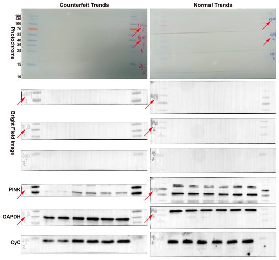 It was confirmed via special handwriting that the three bands originated from the same membrane. By manipulating the total protein mass, we faked the low, high, and medium trends of protein bands, but the reference protein also showed the same trend, proving that there were traces of forgery. Red arrows indicate individual handwriting. The experimental procedure was the same as the standard experimental procedure.