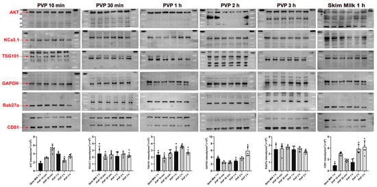 Blocking buffer prevents primary antibody non-specific binding and improves the signal-to-noise ratio. For some high-quality antibodies, blocking may not be performed. We compared the blocking efficiency of polyvinylpyrrolidone (PVP-40) 1% + Tween 20 0.05% with 5% skim milk + Tween 20 0.05%. The signal intensities of AKT, Rab27a, and CD81 were significantly higher in PVP-40 blocking for 10 min than skim milk blocking for 1 h, and the signal intensities of TSG101, KCa3.1, and GAPDH were also not inferior to those of the latter (Figure 5). In addition, commercial blocking buffer did not show overwhelming advantages compared with PVP-40 (Figure 1D). However, aqueous buffers of PVP-40 are prone to spoilage and can only be stored for a week at room temperature. Adding 0.05–1% non-toxic ProClin (Beyotime, Shanghai, China) can greatly extend the shelf life.