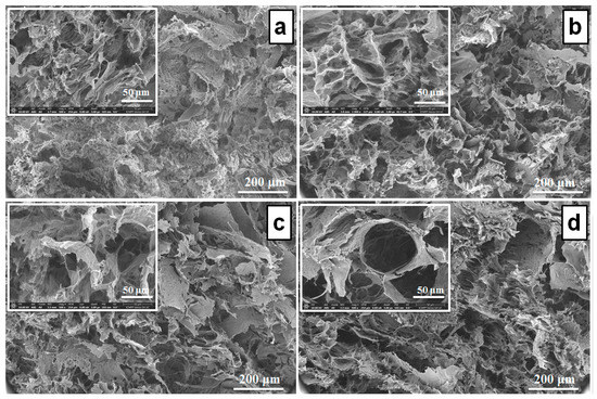 SEM images of the PVA/XG-80/20 hydrogel (a) and the PVA/XG-80/20 hydrogels loaded with neomycine; PVA/XG-80/20-1 (b), PVA/XG-80/20-2 (c), PVA/XG-80/20-3 (d).