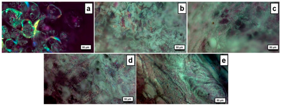 The morphology of the microstructure was further examined by means of polarized optical microscopy (POM). As observed in Figure 3a, neomycin sulfate exhibits birefringence under the POM observation, due to its chiral structure and anisotropic crystal lattice [41], which cause the rotation of plane-polarized light passing through the crystals, resulting in characteristic interference patterns and colors. The neat PVA/XG-80/20 sample without any drugs (Figure 3b) exhibited a compact and dense morphology, in contrast to the surfaces of samples containing higher concentrations of neomycin sulfate (Figure 3c–e), which displayed a grainy texture. This grainy texture suggests the potential presence of larger diameter pores within the inner layers of the material. These distinctive colors and birefringency, intensifying with increasing amounts of neomycin sulfate, were also observed in the neomycin-loaded PVA/XG-80/20-1, PVA/XG-80/20-2, and PVA/XG-80/20-3 samples (Figure 3c–e) under POM observation. These observations are indicative of the relatively uniform dispersion of neomycin sulfate within the dry hydrogel network.