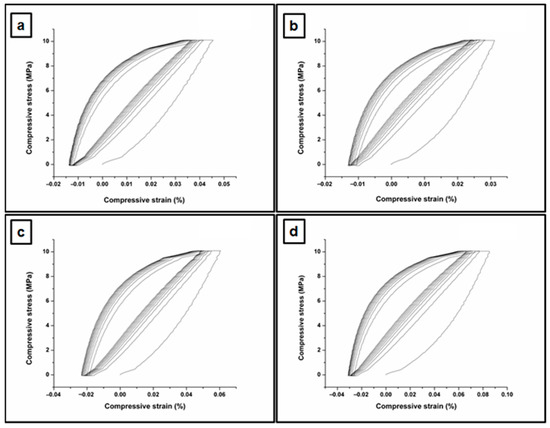 Compressive stress–strain curves of the studied PVA/XG-80/20 hydrogels in the series under 10% compression at room temperature; PVA/XG-80/20 (a), PVA/XG-80/20-1 (b), PVA/XG-80/20-2 (c), PVA/XG-80/20-3 (d).