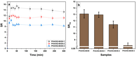Swelling profiles in phosphate buffer pH 7.4 at 37 °C of PVA/XG-80/20 hydrogels loaded with neomycin sulfate (a) and swelling profile at equilibrium for all the samples (b).
