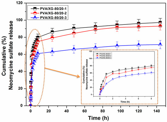 Comparing the release rates of the three studied formulations, the influence of the neomycin content, which was observed on the morphology (dimensions of the pore size) and swelling capacity and the physical interaction between the drug and the matrix, could be observed. The samples with the highest swelling capacity (PVA/XG-80/20-1) exhibited the highest release rate due to the increased ease of drug dissolution and diffusion into the release medium. Also, the PVA/XG-80/20-1 sample showed a slightly faster release than the PVA/XG-80/20-2, probably because the weak interaction between matrix and drug led to a higher release rate. In the case of the sample with the highest content of the drug (PVA/XG-80/20-3), was observed a slowest release rate, according to the increase of the intra- and inter-molecular interactions between the matrix and the drug, which is in close correlation with other studies [48].