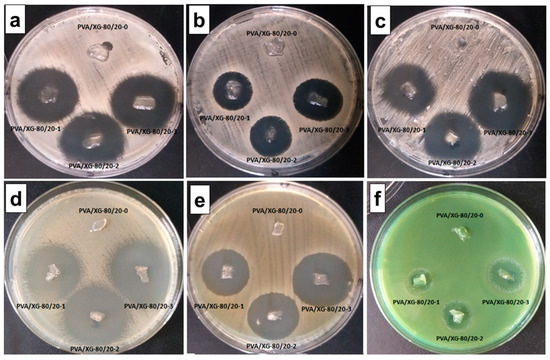 The cut-off values of the mean inhibition values obtained with Escherichia coli ATCC 25922 ranged from 9.66 ± 0.577 mm (PVA/XG-80/20-1) to 13.66 ± 0.577 mm (PVA/XG-80/20-3) (Figure 7d). Against Klebsiella pneumoniae ATCC 13883 the zones of inhibition varied between 9.66 ± 0.577 mm (PVA/XG-80/20-1) and 11.66 ± 0.577 mm (PVA/XG-80/20-3) (Figure 7e). Against Pseudomonas aeruginosa ATCC 27853, the antimicrobial effect was lower, and the value limits of the inhibition zones varied between 2.66 ± 0.577 mm (PVA/XG-80/20-1) and 6.66 ± 0.577 mm (PVA/XG-80/20-3) (Figure 7f).