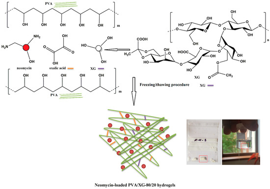 In the present study, neomycin sulfate was loaded into the PVA/XG-80/20 hydrogels as an active compound to treat bacterial infections. In this respect, PVA/XG-80/20 hydrogel was used as a polymer matrix for different amounts of neomycin sulfate. PVA-XG hydrogels cross-linked with oxalic acid were prepared using PVA and xanthan gum as co-polymer networks using the freezing–thawing method followed by thermal treatment, as presented previously in our paper [19]. A schematic illustration of the neomycin-loaded PVA/XG-80/20 hydrogels is given in Scheme 1.