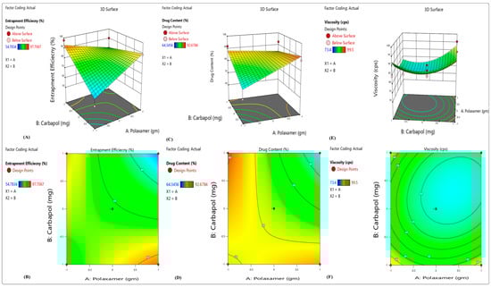 3D response surface plots showing the effects of independent factors on (A,B) percentage entrapment efficiency, (C,D) percentage drug content and (E,F) viscosity.
