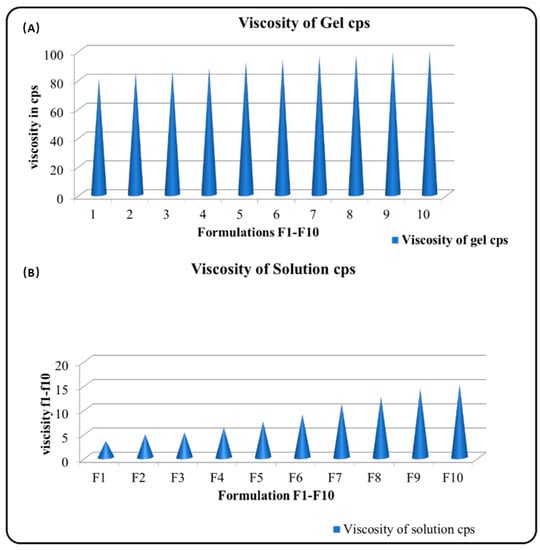 The viscosity of norfloxacin reverse gelatination gel solution was measured using a Brookfield Viscometer at temperatures below 10 °C. The viscosity of the formulations was determined at 1–50 rpm at a temperature of 35–37 °C [34,35].