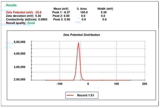 The zeta potential of the dispersion determines the stability of colloidal dispersion. The optimal zeta potential values, which indicated stability and did not create aggregates, were found to be in the vicinity of −35.6 mV, as shown in Figure 3.