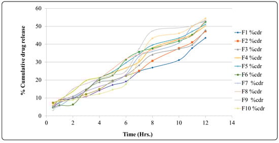 Table 6 and Figure 4 show the percentage cumulative drug release (%CDR) of pure norfloxacin and the optimized formulation (F10) at different time points. The results show that the %CDR of the optimized formulation is consistently higher than the %CDR of the pure drug. At 0.5 h, the %CDR of the pure drug is 6.22%, while the %CDR of the optimized formulation is 0.39%. This suggests that the optimized formulation releases norfloxacin more quickly than the pure drug. At 1 h, the %CDR of the pure drug is 8.55%, while the %CDR of the optimized formulation is 5.15%. This suggests that the optimized formulation continues to release norfloxacin more quickly than the pure drug over time. At 12 h, the %CDR of the pure drug is 54.44%, while the %CDR of the optimized formulation is 81.29%. This suggests that the optimized formulation is able to release a significantly higher percentage of norfloxacin than the pure drug over a 12 h period. The findings suggest that the optimized formulation is a more effective delivery system for norfloxacin than the pure drug. The optimized formulation is able to release norfloxacin more quickly and at a higher percentage than the pure drug. This suggests that the optimized formulation could be used to improve the efficacy of norfloxacin therapy.