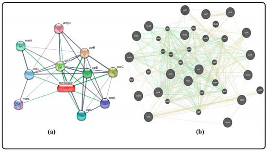 Gene–gene interaction of norfloxacin (a) through STITCH software gene prediction, and (b) through GeneMania software gene prediction.
