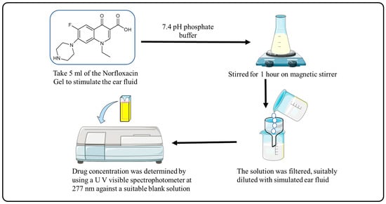 Adding 5 mL of the solution to stimulate the ear fluid with pH 7.4 phosphate buffer and stirring for 1 h on a magnetic stirrer was used to determine the drug content of norfloxacin-loaded reverse gelatination gel formulations. The solution was filtered and diluted with simulated ear fluid, and the drug concentration was evaluated against an appropriate blank solution using a UV visible spectrophotometer at 277 nm (Figure 7).