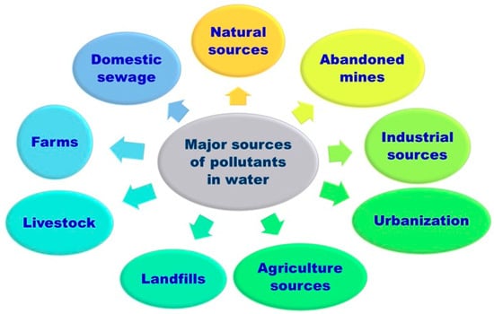 Life is conditioned by water for which there are no substitutes. Freshwater is a renewable natural resource, vital to the functioning of the Earth system, but present in finite quantities. Humans, plants, and animals need water to survive. Freshwater is used in agriculture, industry, power generation, sanitation, construction, transportation, and virtually in every aspect of human life. There is an imperative demand to protect freshwater ecosystems as much as possible. In addition to adapting human activities to the limits of nature’s capacity, innovative techniques are needed to protect limited water resources from pollution and to ensure the preservation of an adequate supply of good quality freshwater. With the growth of the population (which has reached the threshold of 8 billion people), the evolution of modernization, and the growth of industrialization, water pollution has become an increasingly serious problem worldwide. Various harmful pollutants such as dyes, drugs, heavy metal ions, detergents, and personal care products, derivatives or by-products of various industries (e.g., oil, mining, printers, energy, etc.) are released into the environment. Figure 1 shows the most common pathways of water pollution.