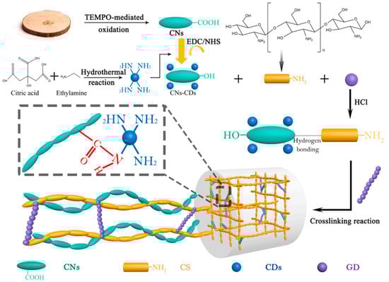 Diagram of the chitosan-based hydrogel preparation method. (Notation: CNs—cellulose nanomaterials; CS—chitosan; CDs—carbon dots; CD—glutaric dialdehyde; EDC—N-(3-dimethylaminopropyl)-N’-ethylcarbodiimide hydrochloride; NHS—N-hydroxysuccinimide). Reprinted with permission from ref. [72] Copyright 2023, Elsevier.