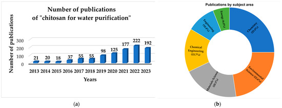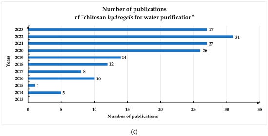 (a) Number of publications (articles and reviews) of chitosan for water purification from 2013 to August 2023; (b) publications by subject area (articles and reviews) of chitosan for water purification from 2013 to August 2023; (c) number of publications (articles and reviews) of chitosan hydrogels for water purification from 2013 to August 2023. Data were collected using the Scopus database [75].