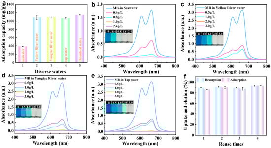(a) Adsorption capacity for MB in various waters; removal rate toward MB in (b) seawater, (c) Yellow River water, (d) Yangtze River water, (e) tap water; and (f) adsorption capacity at different adsorption/desorption cycles (MB concentration: 500 mg/L; initial pH 10; temperature: 30 °C). Reprinted with permission from ref. [93] Copyright 2023, Elsevier.