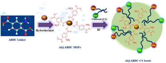 Representation of the formation mechanism of organic aluminum (Al) frameworks functionalized with 2-aminobenzene-1,4-dicarboxylic acid (ABCD) and incorporated into hybrid CS beads. Reprinted with permission from ref. [164] Copyright 2023, Elsevier.