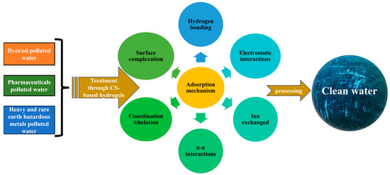 Various adsorption mechanisms (electrostatic interactions, complexation, hydrophobic interactions, coordination/chelation, pore filling, ion exchange interactions, and hydrogen bonding) between sorbent and sorbate are involved during the adsorption of different pollutants from wastewater by means of CS beads [135].