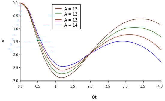 Equation (7) is graphically represented in Figure 1, having four parameters with different values. Now, it can be mentioned that the circumstance that V(Qt) describes is comportment covered by a pair of potential wells. The comportment in discussion admits that, from the perspective of progress to equilibrium and, obviously, the steadiness of the equilibrium circumstances, the fractal system governed by Equation (7) is of a similar manner to that of the fractal oscillator related to the fractal potential formula. The certainty values of V(Qt) can be considered actual states/positions of equilibrium, but at the same time, the maximum limits are within the domain of the values, which can be assimilated with unsteady equilibrium positions.