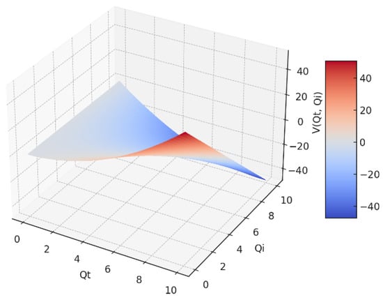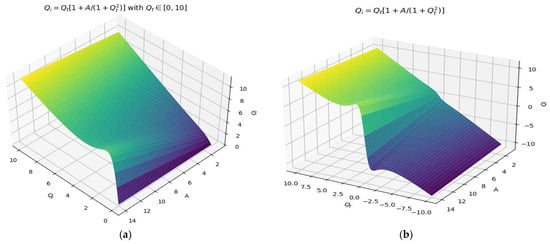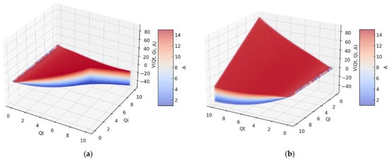 In Figure 4, we have two 3D graphs of the fractal potential, (a) and (b), of three variables V = V(Qt,Qi,A), with two distinct orientations concerning the axes of the variables Qt and Qi. Constant A has positive values between 1 and 14, which can be seen on the colored bar on the right with distinct colors from blue to red-brown.