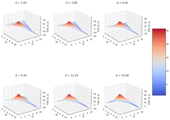 Six 3D graphs of the fractal potential as a function of Qi and Qt, each for a different value of the constant A are presented in Figure 3.