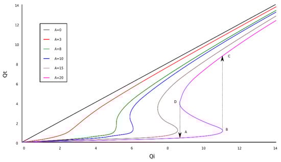 The curves for six values of A (Figure 6) show a maximum and a minimum when attains certain values. The points marked with A, B, C, and D indicate the presence of bi-stability. Practically, this is represented by the Qt = f(A, Qi) variation.