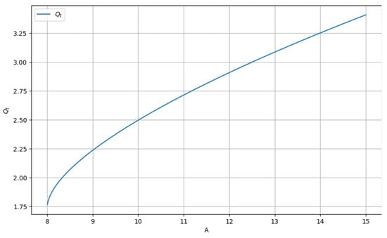 The fractal potential as a function of the constant A, Qt = f(A) for values of A greater than 8, can be found in Figure 7. The value of the potential Qt increases rapidly with the increase in the constant A.