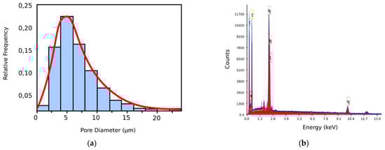 In Figure 9a, we have the pore histogram for the 6X SEM image, and in Figure 9b, there is the SEM-EDX spectrum of the 6X-Hg image, confirming the presence of mercury in the investigated sample. Regarding the histogram of the xerogel in the 6X image, we notice that, at its upper limit, it looks like a normal distribution; the red line continues in the graph [].