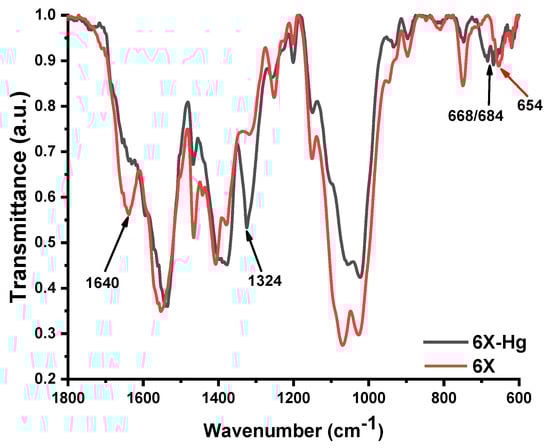 In Figure 10, there are two so-called FTIR (Fourier-transform infrared spectroscopy) spectra for two distinct chemical compounds. The first compound is a simple xerogel, coded 6X, with the spectrum having a red color, and the second is a compound made of mercury bonding to xerogel, coded 6X-Hg, which has a black color.