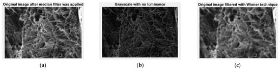 (a) The original image filtered with a median filter; (b) the image of interest in grayscale and without luminance; (c) original image filtered with Wiener filter.