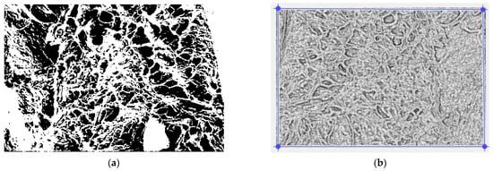 Figure 13a,b show the images processed in the binary version and, respectively, the definition of the applied mask used to calculate the lacunarity.